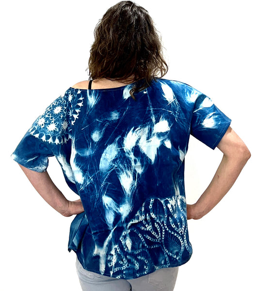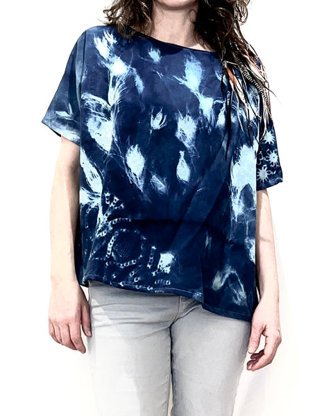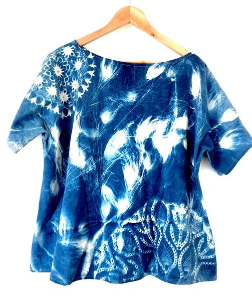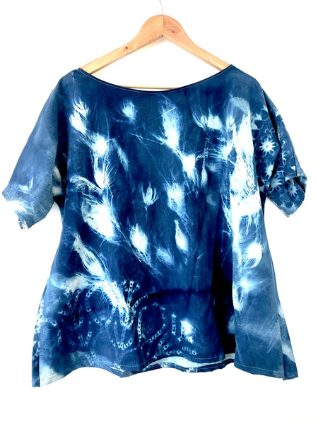 A one-of-a-kind creation made from a recycled cotton sheet, entirely cut and sewn by hand. Sun-printed and adorned with peacock feathers and lace, each piece is handmade without a pattern. Every detail tells its own artisan story.