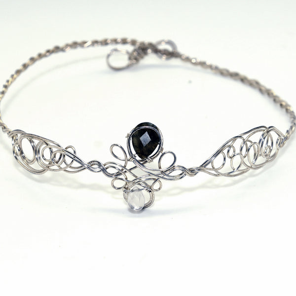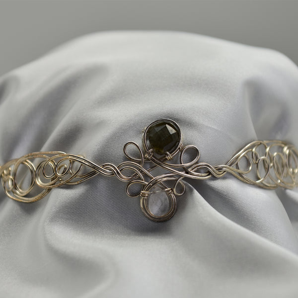 Entrez dans l’élégance lunaire avec la Couronne Halo Moonveil, faite à la main avec de la labradorite et de la pierre de lune, délicatement tissées dans un fil de cuivre recouvert d’argent.